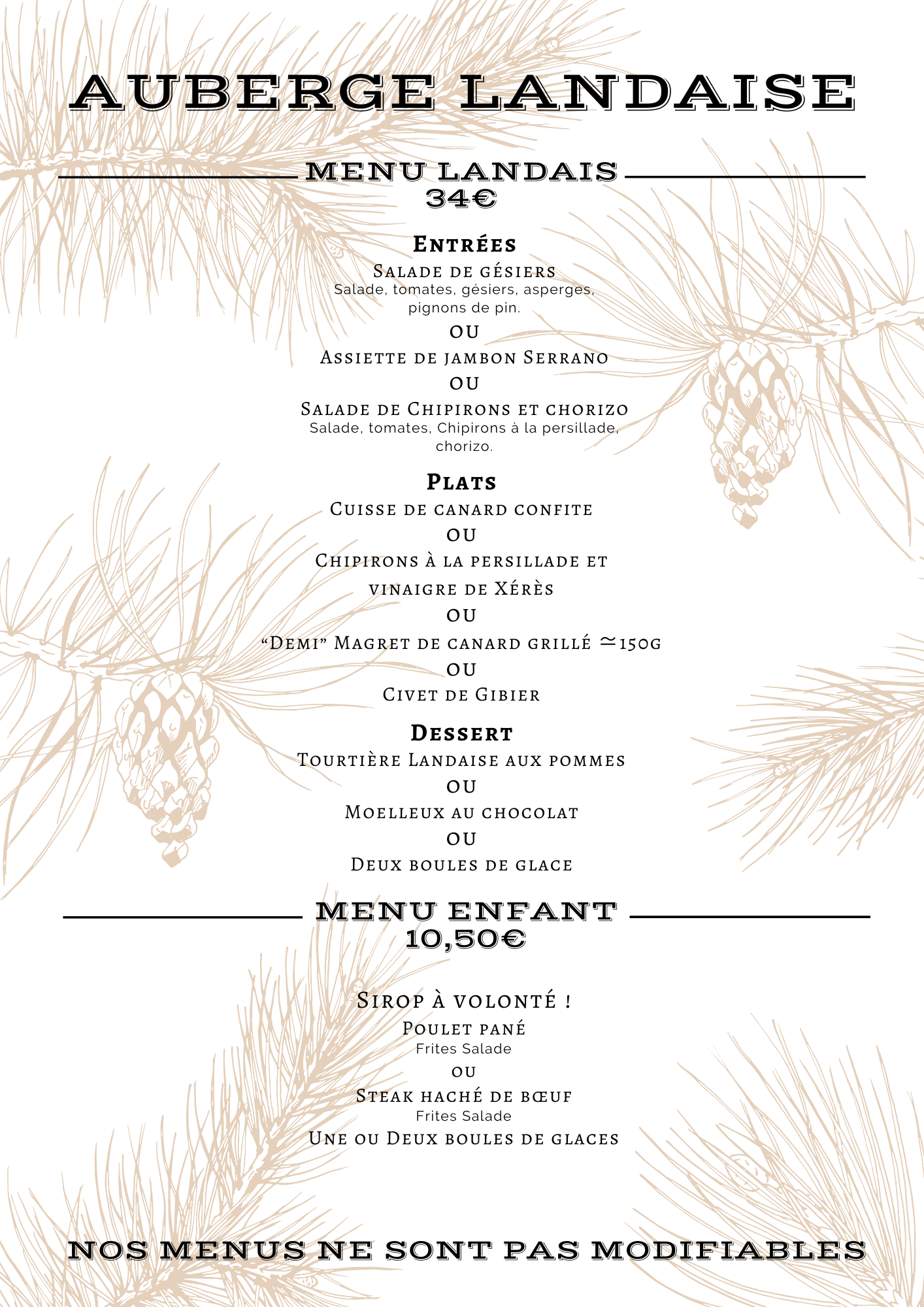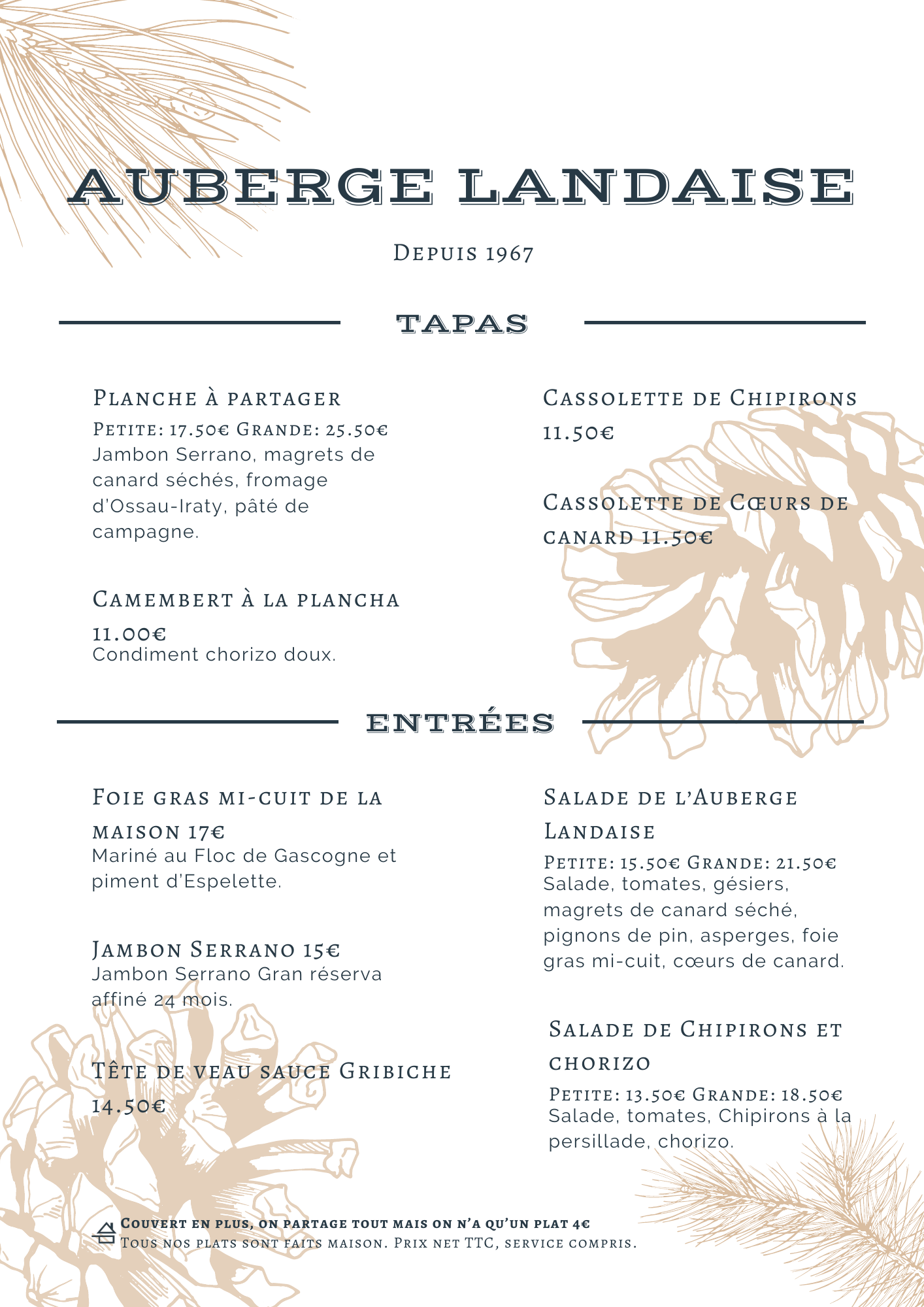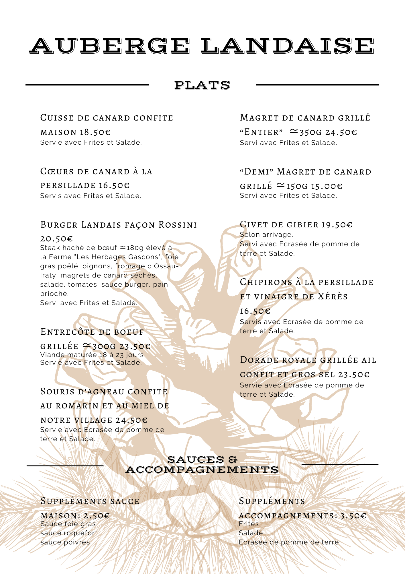Notre restaurant familial L'Auberge Landaise à Lüe vous propose des formules variées : menus à 28 euros et à 38.50 euros, composés d'une entrée, d'un plat, de fromage et d'un dessert. La petite formule, disponible en semaine au tarif de 13.50 euros, se compose d'une entrée, d'un plat et d'un dessert. Notre carte évolue au fil des saisons et nous vous suggérons différentes recettes conçues quotidiennement et minutieusement par notre chef cuisinier. Pour compléter votre assiette, nous mettons à votre disposition une carte de vins diversifiée ainsi que des boissons et des apéritifs : cocktails, softs drinks, etc. Outre la restauration, nous prenons en charge l'organisation de tous types d'événements.
